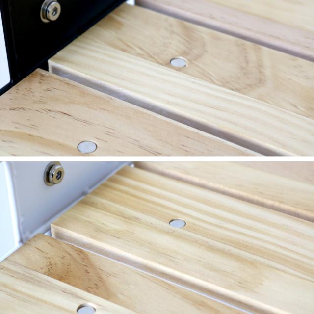 カゴ棚の棚板にはパイン材を使用しています。天然木ならではのナチュラルで美しい木目が、お部屋に柔らかな印象を与えてくれます。