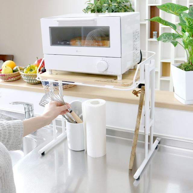 棚部分の耐荷重は約3kgで、食器や調味料、トースターやケトルなど、キッチンやリビングで必要な物を置くことができます。