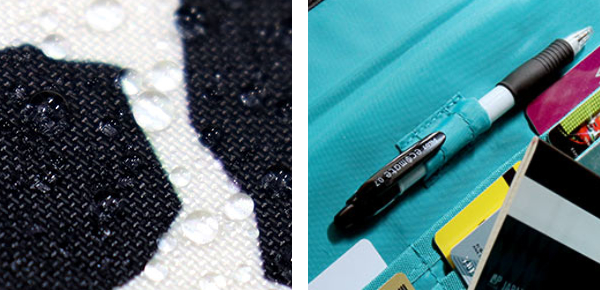 | 撥水加工 水や汚れに強く、お手入れしやすい撥水加工を施しています。 | ペン差し 急な書き物の際もサッと取り出して便利に使えます。 |