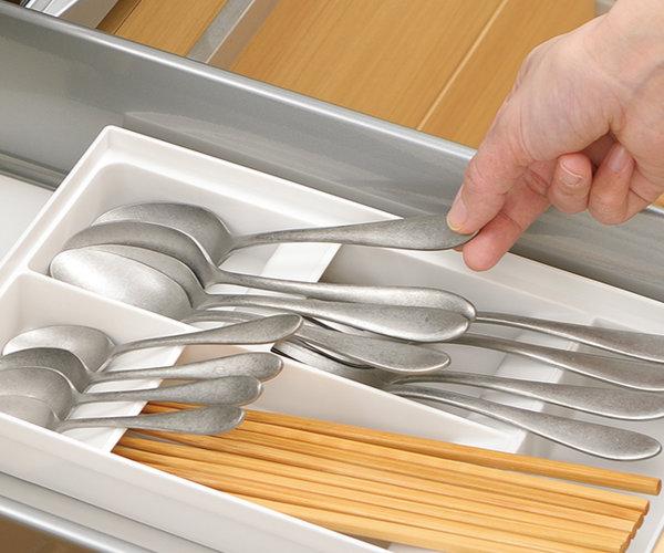 キッチン引き出しの中をサイズ別に分けて、様々なカトラリーの定位置を作り美しく収納できます。どこに何があるか引き出しを開けたときに分かりやすく、出したカトラリーをどこに戻すかも一目瞭然です。