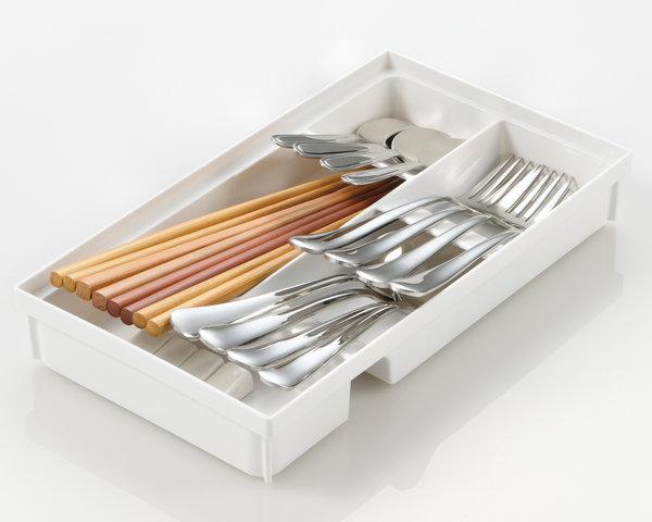 浮かせたカトラリーの持ち手の下のスペースに箸置きなどの小物を収納できます。抗菌加工済みのプラスチック製で、丸洗いしてお手入れ可能です。