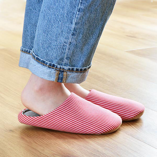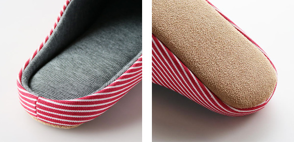 | 履き心地 中敷きはフカフカしていて履き心地抜群です。また、中敷きは取り外しが出来ないようになっており、歩いている途中でズレたり取れたりする心配がいりません。 | 静穏設計 音がしにくいポリスウェード生地を採用しているので、スリッパ特有のパタパタ音が鳴りにくいです。 |