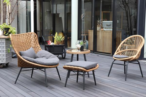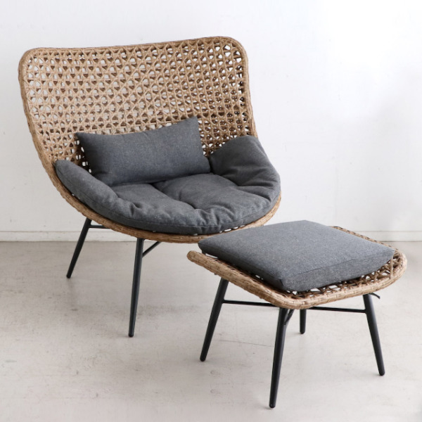 ベランダやウッドデッキに置くのはもちろん、室内でも十分に使える魅力的なラタン風チェアです。オットマンがセットになっているため脚を上げてゆったりと寛ぐことができ、リゾート気分が味わえます。