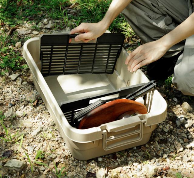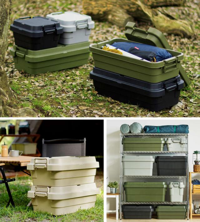 耐荷重100kgの頑丈さが特徴の『トランクカーゴ』は、「座れる」「しまえる」「積み重ねられる」「持ち運べる」の多機能なフタ付き収納ボックスです。ロータイプは荷物が取り出しやすい浅型で、食器やコーヒーセット、ランタン、グローブ等の小物収納に最適です。無骨でシンプルなデザインで、屋外・屋内問わずに様々なシーンで活躍してくれる万能収納アイテムです。