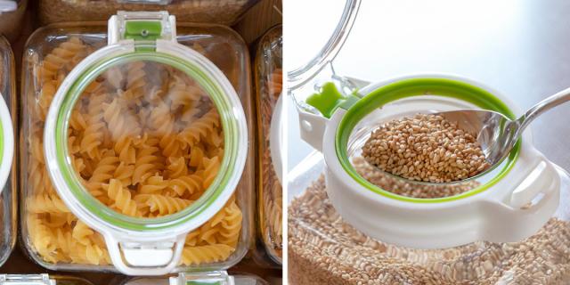 透明度が高く、中身がしっかり見えるのでパスタやグラノーラなどを入れ、飾るように棚に置くのもおすすめです。高さや幅を揃えて収納すると、統一感がでます。