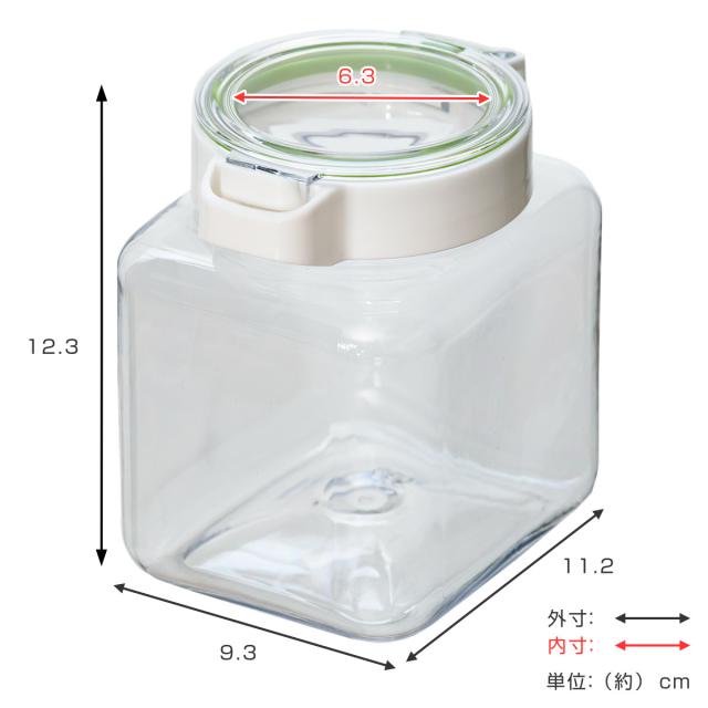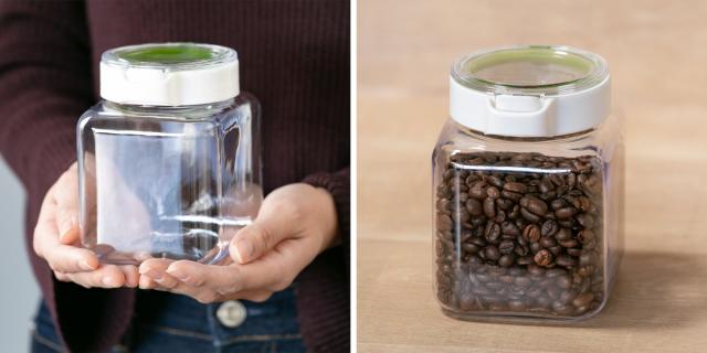 | 軽くて丈夫なプラスチック製 表面に傷が付きにくく劣化や衝撃にも強いプラスチック製なので、誰でも使いやすい保存容器です。 | 容量(850ml) 珈琲豆やドライフルーツの保存用にしたり、かつお節やパン粉などの調味料入れておくだけで、キッチンのアクセントになります。 |