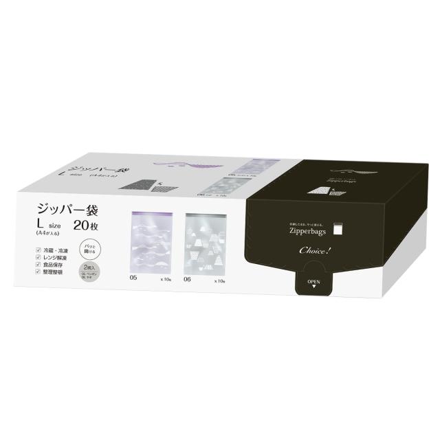 ●縦置き横置きどちらにも対応するボックスを採用した、Choice!シリーズのジッパー袋Lサイズ20枚入りです。