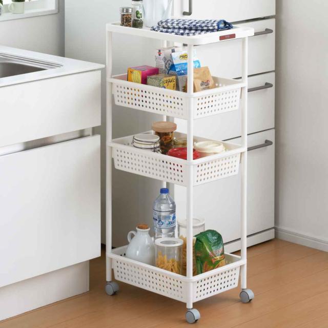 フラットで物が落ちにくいように縁が高く作られた上段と3段のメッシュバスケットで収納力もたっぷりです。カゴ型なので、物をいれたまま移動させても、落ちる心配がなく安心して運ぶことができます。ティータイムの時にお菓子やティッシュなど必要なものを入れて、テーブル脇に置いておけば、後からキッチンに取りに行くこともなくなり便利です。最下段には2Lのペットボトルが縦置きできます。