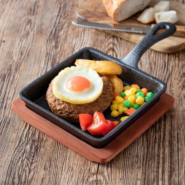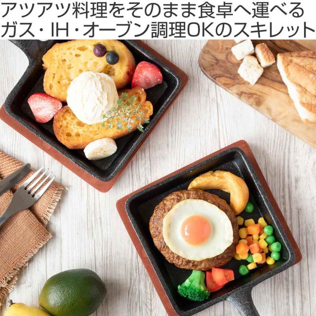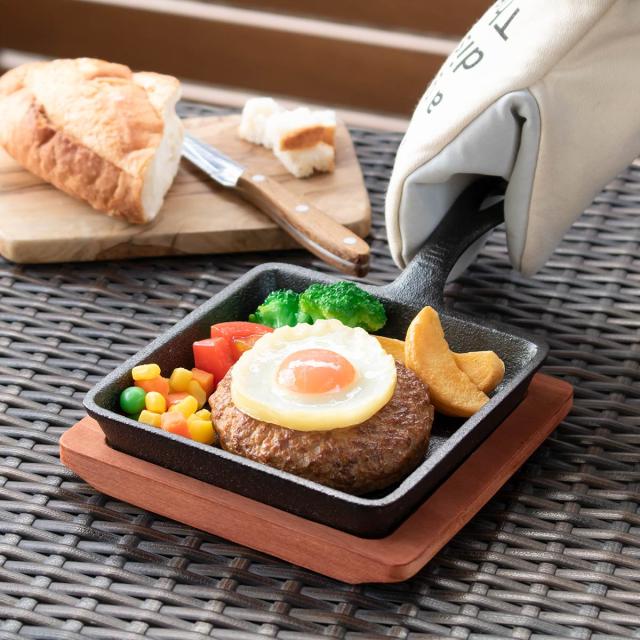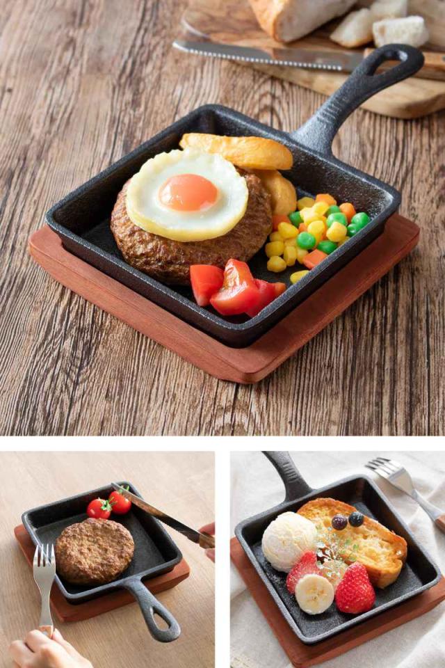 鉄鋳物製の角型スキレットです。食材への火あたりが柔らかく、じっくりと均等にムラなく火を通して旨みを引き出します。保温性も高く、ハンバーグやステーキ、アヒージョなどのグリル料理も出来立てアツアツのまま楽しめます。木製プレート付きなのでそのまま食卓へサーブすることができ、人気のカフェ風スイーツもおうちで手軽に楽しめます。