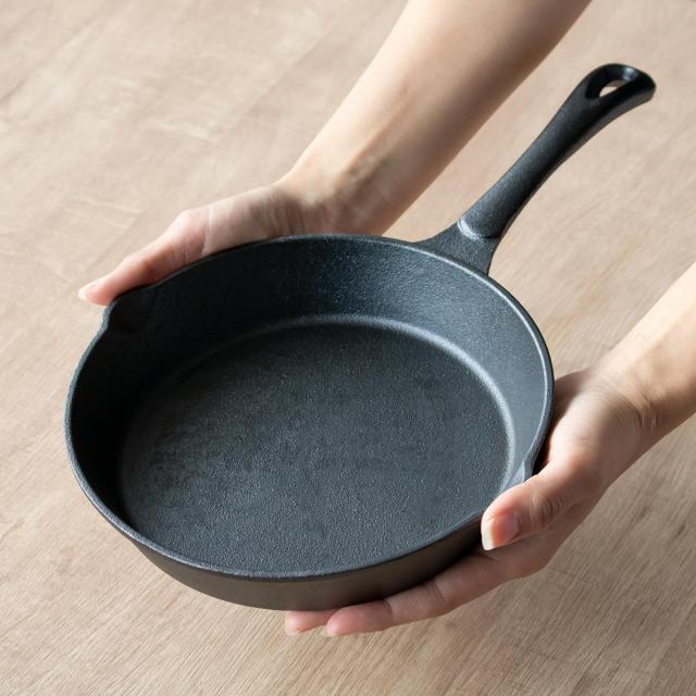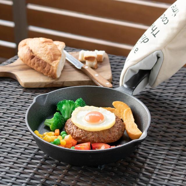 鉄鋳物製のスキレットです。食材への火あたりが柔らかく、じっくりと均等にムラなく火を通して旨みを引き出します。保温性も高く、ハンバーグやステーキ、アヒージョなどのグリル料理も出来立てアツアツのまま楽しめます。フレンチトーストやダッチベイビーなどの人気のカフェ風スイーツもおうちで手軽に楽しめます。