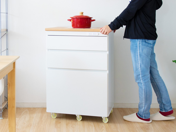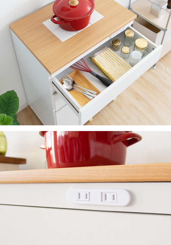 上段はカトラリーや小物を整理しやすい浅型タイプの引出し収納付きです。また、前面には便利な2口コンセント付きです。手前にあるのですぐに差し込めてキッチンでの作業もはかどります。