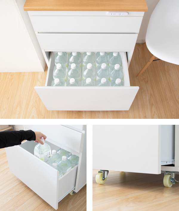 下段の深型引出しは2Lペットボトルが15本入る大容量タイプです。引出しにもキャスターが付いており、重い物を入れてもスムーズに動きます。ストックなど、収納しておきたい物が多いキッチンにおすすめです。