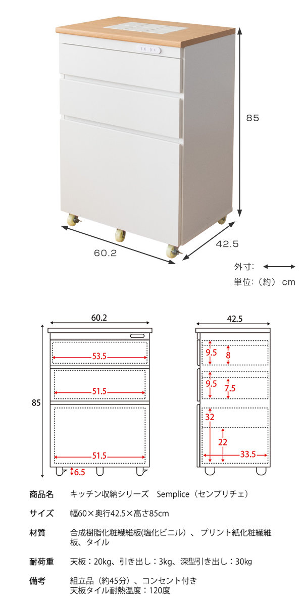 | 耐荷重 | 引出し:3kg 深型引出し:30kg |