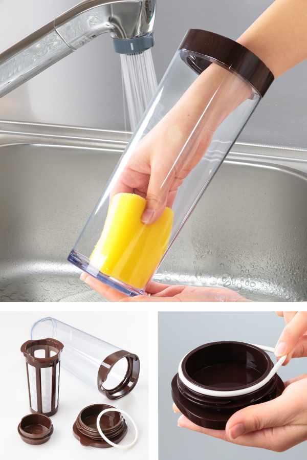 広口タイプなのでしっかり手を入れて奥まで洗えます。フタ・ネジ栓部には茶渋付着防止加工ほどこされ、分解もできるのでお手入れが簡単です。