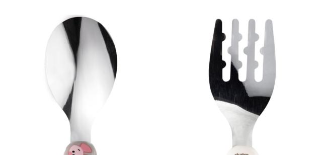 小さな手でも握りやすい太目の樹脂製グリップです。先端はステンレス製なので耐久性に優れ、かつ衛生的にお使いいただけます。ひとりで食べる練習を始めるお子さんにぴったりです。
