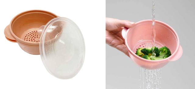 ザルが付いているので野菜を洗ってそのまま容器に入れて加熱できます。保存に便利な蓋付きで、保存容器としてもお使いいただけます。