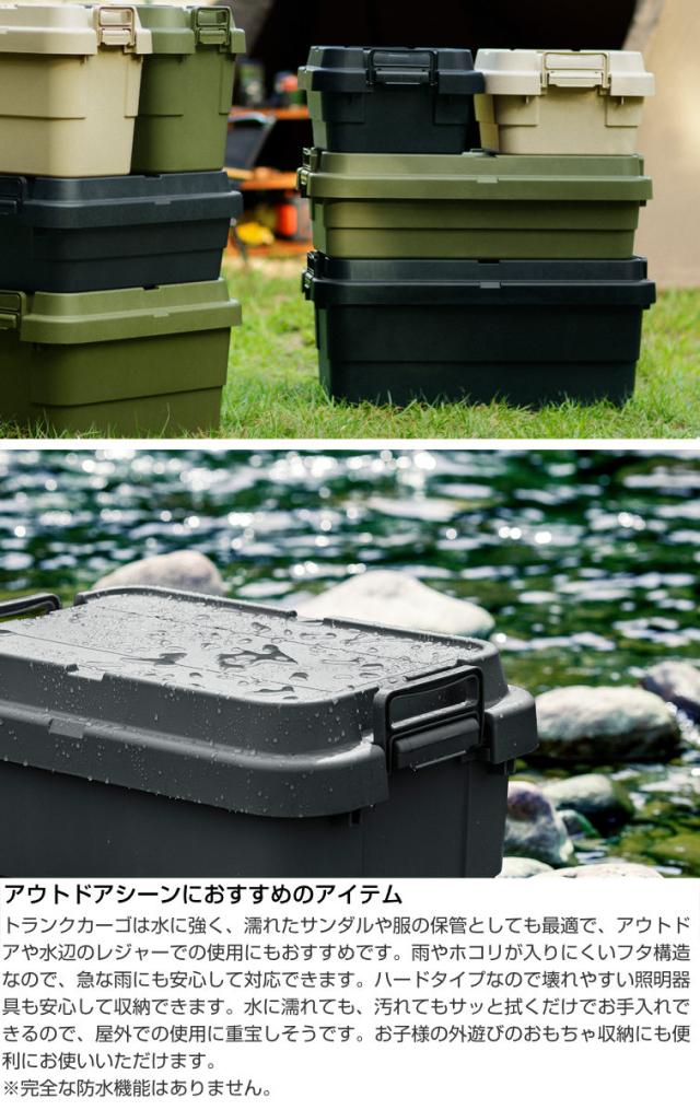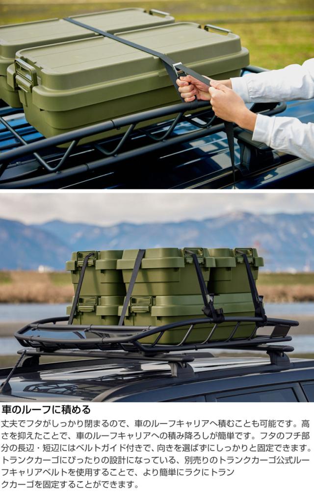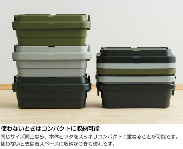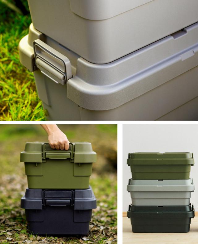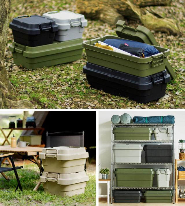 耐荷重100kgの頑丈さが特徴の『トランクカーゴ』は、「座れる」「しまえる」「積み重ねられる」「持ち運べる」の多機能なフタ付き収納ボックスです。ロータイプは荷物が取り出しやすい浅型で、食器やコーヒーセット、ランタン、グローブ等の小物収納に最適です。無骨でシンプルなデザインで、屋外・屋内問わずに様々なシーンで活躍してくれる万能収納アイテムです。
