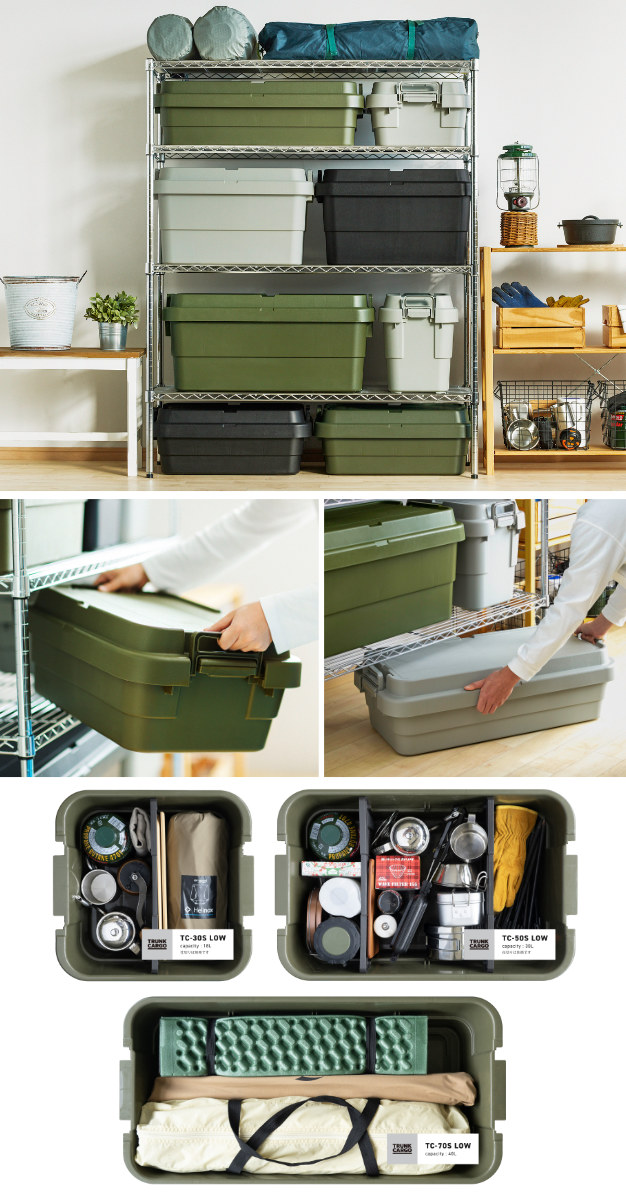 トランクカーゴシリーズは、あらゆるシーンに合わせて使える幅広いサイズ展開です。用途に合わせてサイズ違いや同サイズで揃えることで、アウトドアシーンもお部屋でも統一感のある、快適な収納空間をつくることができます。より収納の幅を広げてくれるアイテムも展開されているので、お好みの組み合わせにアレンジして自由に楽しむことができます。