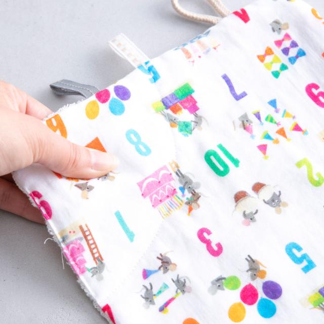 ハンカチの周りには、さまざまな種類のひもやリボンがついています。触って感触の違いを確かめたり、つまんだりすることで、赤ちゃんの指先や目の運動になり、脳の成長を促します。
