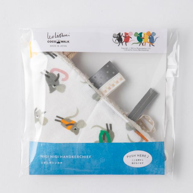 角の一つに押し笛が入っており、押すと音が鳴ります。おもちゃのように赤ちゃんが楽しめるハンカチです。人気絵本作家「レオ・レオニ」の絵本に出てくる可愛いキャラクターが描かれています。