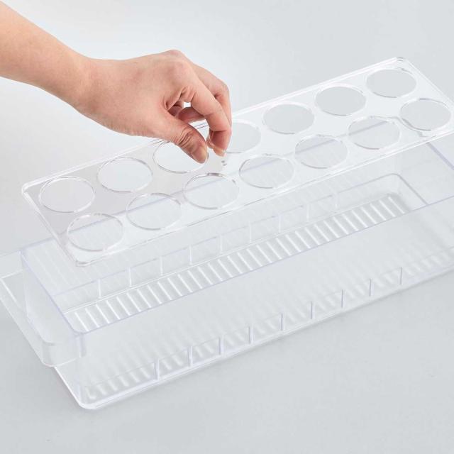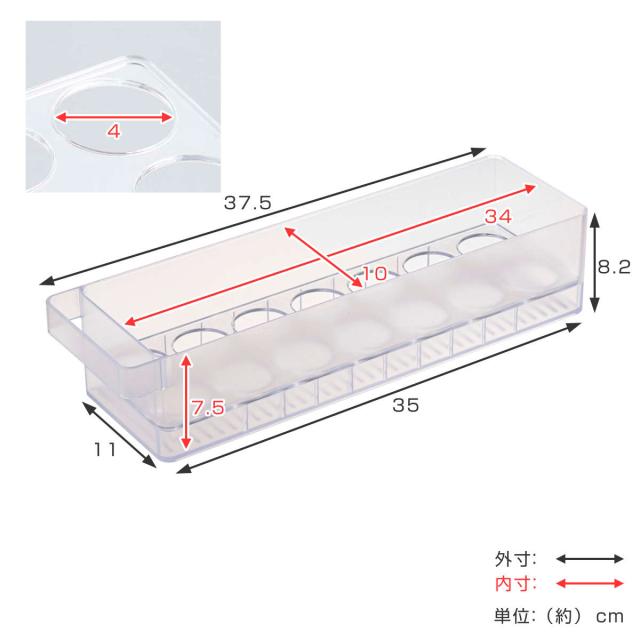| サイズ | 外寸:約 幅37.5×奥行11×高さ8.2(cm) 内寸:約 幅34×奥行10×高さ7.5(cm) カップ直径(卵トレー):約4cm |