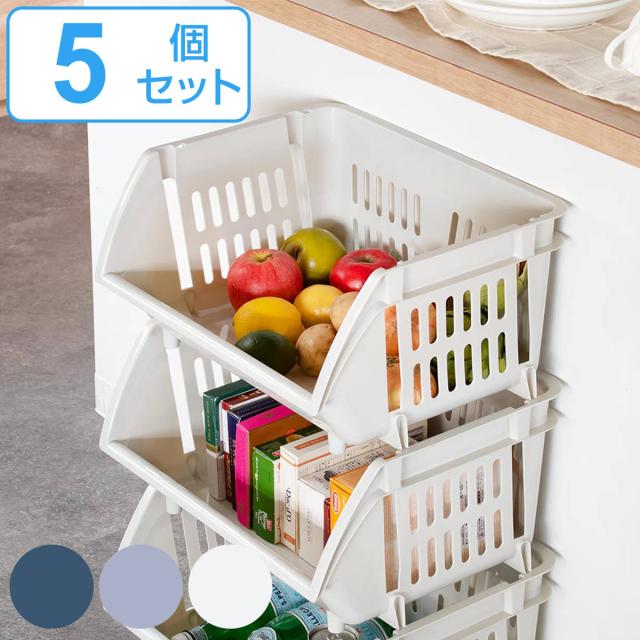収納バスケット 積み重ねバスケット 5個セット ( バスケット 収納 幅44×奥行36.5×高さ23cm 前開き プラスチック ストッカー 収納ボックス ケース 連結 スタッキング ボックス キッチン ランドリー 洗面所 収納ケース )