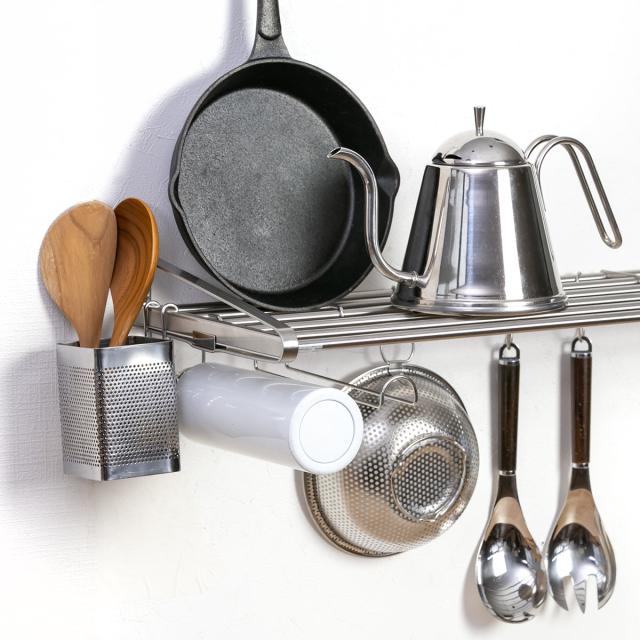 キッチンはもちろんランドリー収納にもピッタリです。タオルや洗剤など毎日使う物を手の届く壁面にスッキリと収納することができます。また、ステンレスのスッキリとしたシルエットはインテリアの邪魔をせず清潔感ある雰囲気をプラスしてくれます。