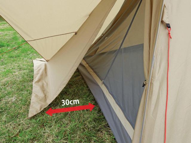 インナーテントとフライシートの間に、奥行30cm程の荷物室を確保しています。