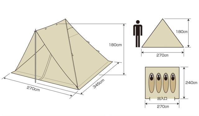 | サイズ | フライ:約 幅270×奥行345×高さ180(cm) インナー:約 幅270×奥行240×高さ180(cm) パッキングサイズ:約 幅66×奥行17×高さ17(cm) |