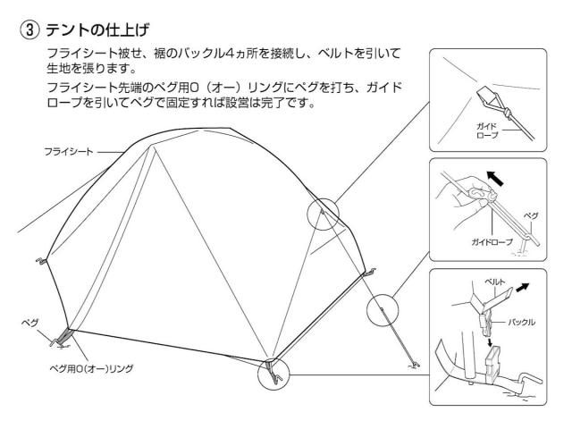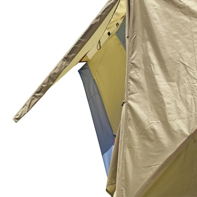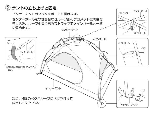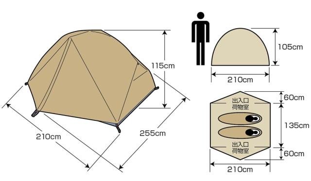 | 材質 | フライ:ポリエステルリップストップ210T(PU2000mm)UV加工、撥水加工 インナー:ウォール=ポリエステル185T(通気性撥水加工)、メッシュ=ポリエステルノーシームメッシュ、フロア=ポリエステルOXF150D(PU3000mm) ポール:アルミニウム合金(直径8.5mm) |