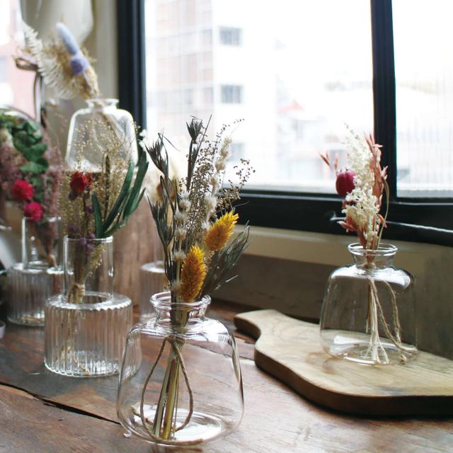 天然の花を丁寧に乾燥させた美しいドライフラワーと、シンプルなガラスのベースがセットになっています。そのまま置くだけで、さりげなく空間に華を添えます。