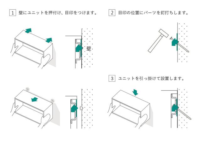 背面には、あらかじめ壁面取付パーツが組み込まれています。目印に合わせて部材を釘打ちするだけで、思った位置に棚を設置することができます。