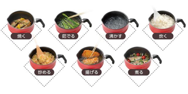 「ゆでる・沸かす・炒める・煮る・揚げる・炊く・和える」の7役使える便利なマルチパンです。7通りの使い方が出来るので、思い立った時にマルチパン1つで気軽に調理ができます。一人暮らしの方やお料理好きな主婦の方、単身赴任のパパや二人暮らしのおじいちゃんおばあちゃんまで幅広い方に使っていただけます。家庭料理に人気のカレーなら3〜4皿分を作ることができます。おかずはもちろん、最大3合までお米を炊くことも可能です。