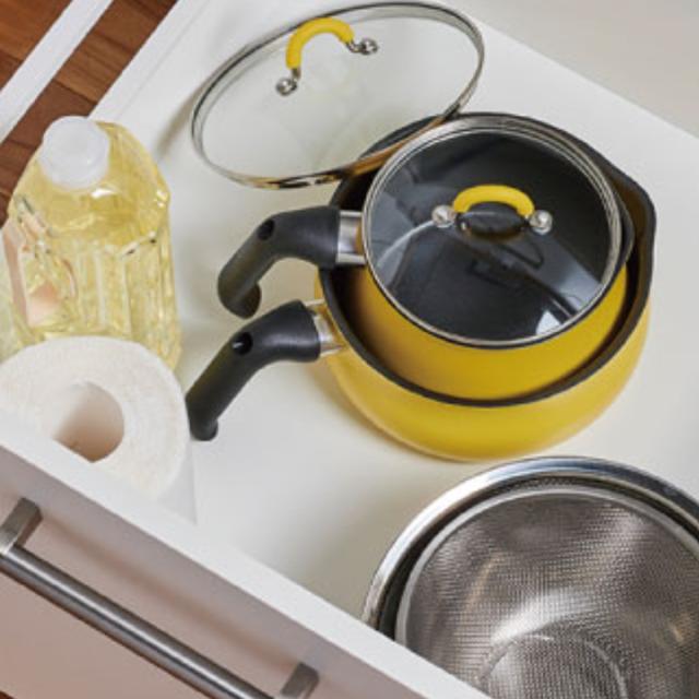 やかんや鍋、ボウルとついつい増えがちな調理器具もマルチパンに集約すればスッキリします。取り出しやすく、後片付けもスムーズになり、収納場所にも困りません。