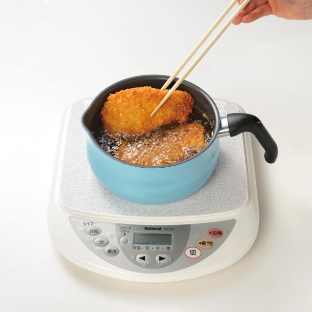 丸みのある形状なので、油ハネしにくくいです。炒め物も食材が飛び散りにくく使いやすいです。キッチン周りも汚れにくいので、日常的に揚げ物もできます。
