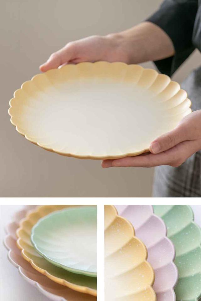 淡いカラーをグラデーションにした柔らかい雰囲気のプレートです。シェルモチーフが可愛らしく、使う度気分が上がりそうです。パンやメイン料理、ワンプレートランチなどを盛り付けるのにちょうどいいサイズ感です。