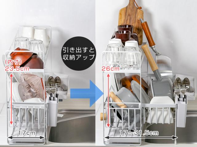 - 狭いシンク脇にピッタリハマりました。伸縮付きなので、洗い物が多くてもフライパン等もしっかり収納されます。白いキッチンに白がピッタリ。高いだけあって作りがしっかりしています。迷いましたが、買って良かった...