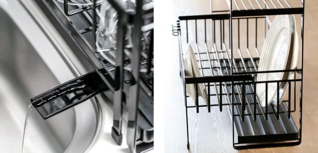 | 水はけでシンクに排水 食器から落ちた水はシンクに流れる設計です。水はけの角度は自由に変えることができます。水止栓で水が流れないようにもできます。 ※水止栓は完全に水漏れを防ぐものではありません | お皿が立てられる スリットを利用して、キレイにお皿を立てて入れられるので、風通しよくスッキリと乾きます。 |