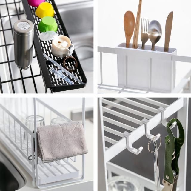 カトラリーポケット・カトラリートレー・フックが付属します。カトラリーや細かいお弁当の小物、寝かせた包丁など整理整頓しながら乾かせます。フックを付けると輪ゴムや水筒パッキン、スポンジなどを引っ掛けて収納できます。