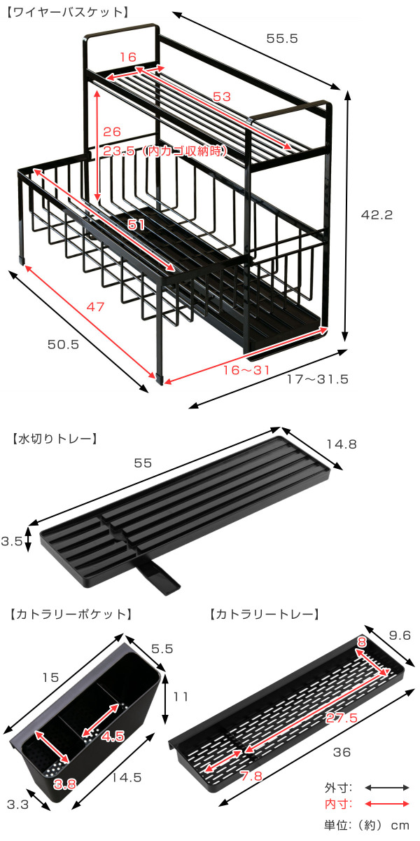 | 耐荷重 | 各ワイヤーバスケット:約 5kg 水切りトレー:約 5kg |