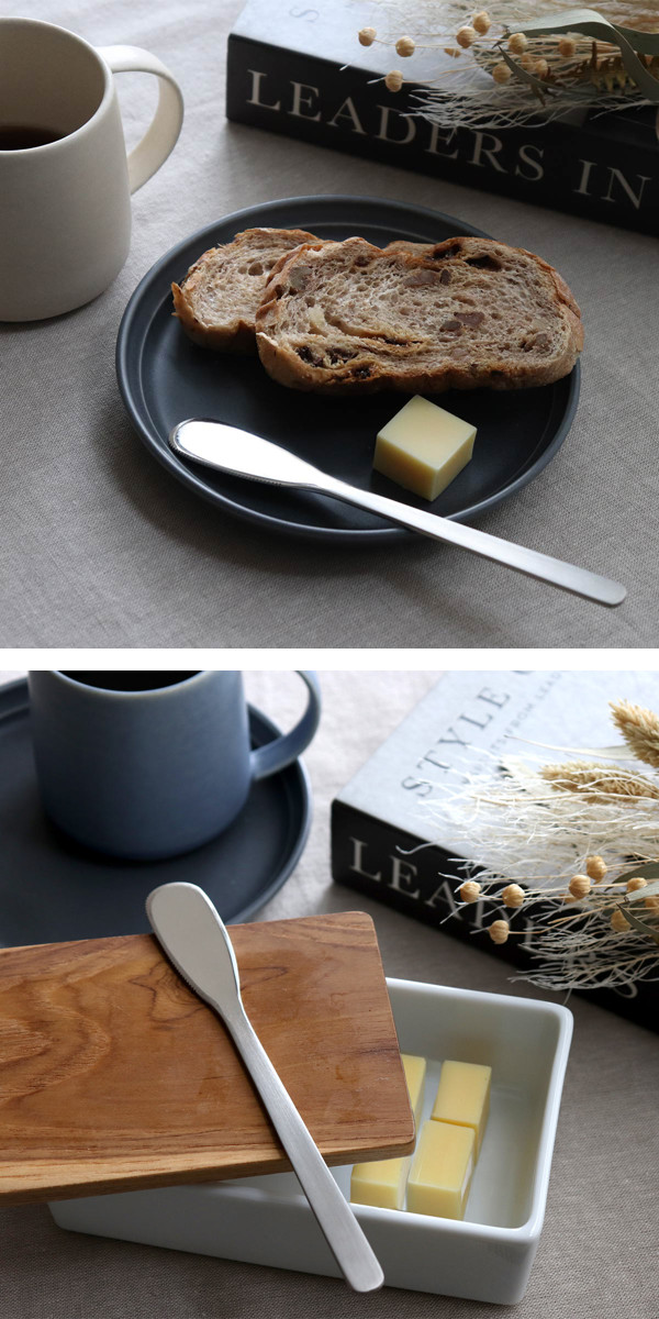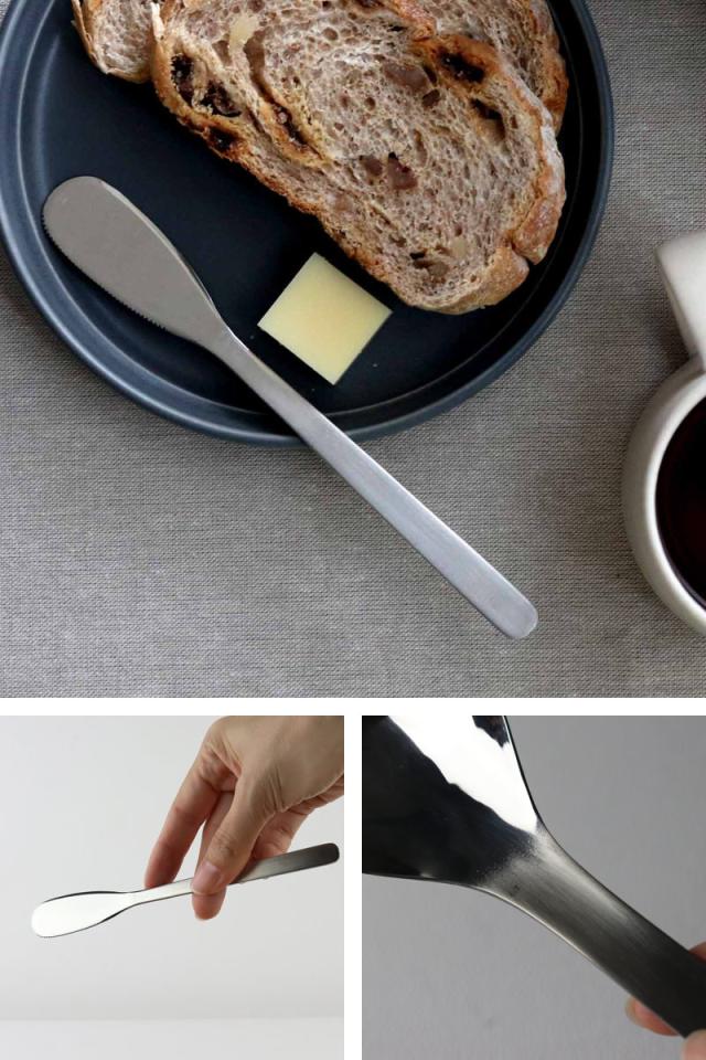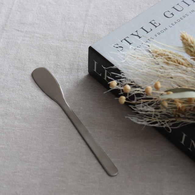 フラットな形状が使いやすい、バターナイフです。角度のないまっすぐな形なのでテンションがかかりやすく、軽い力でバターをすくえます。ピーナッツバターやクリームチーズ、パテなど少し硬さのあるものを取る時にも使いやすいです。