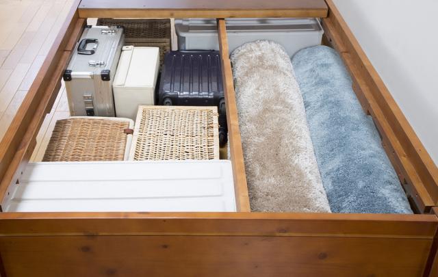 ベッド下は収納スペースとしても活用できます。オフシーズンの衣類や毛布、ラグや季節家電など、かさばるものや使用頻度の低い物の収納にぴったりです。また高さがあるのでベッド下のお掃除も楽に行えます。