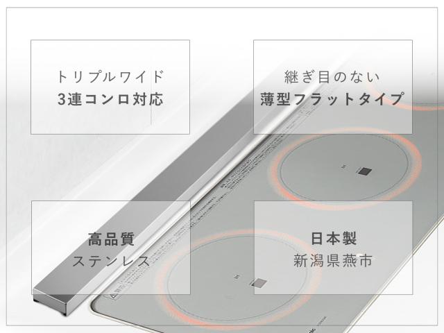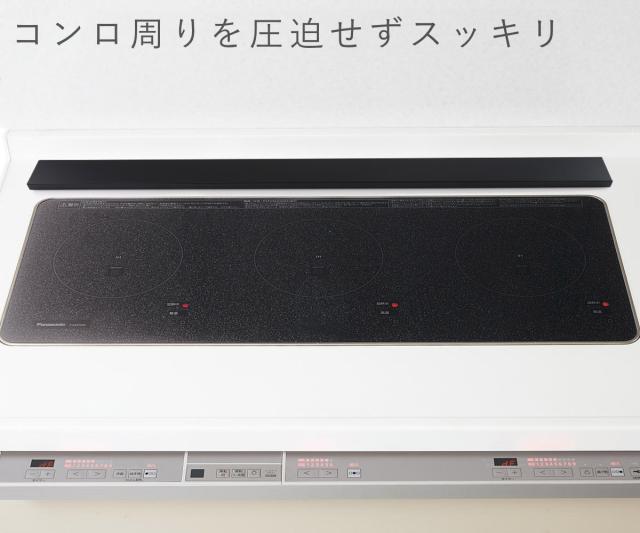 三口が横に並ぶワイドコンロに対応しており、無駄のないデザインとなっています。伸縮でしか対応できなかったワイドコンロにぴったり収まるサイズは、よりキッチンをスッキリと見せることができます。
