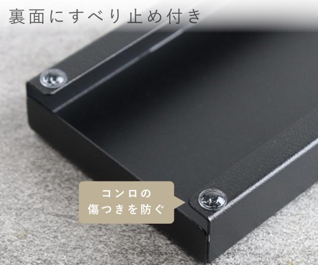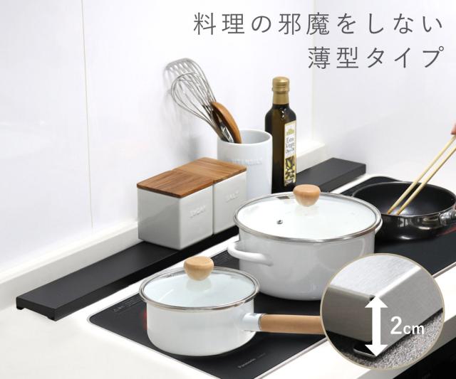 コンロ奥が狭いキッチンでも置けるコンパクト設計です。高さも3.5cmでコンロ周りを圧迫せずスッキリします。