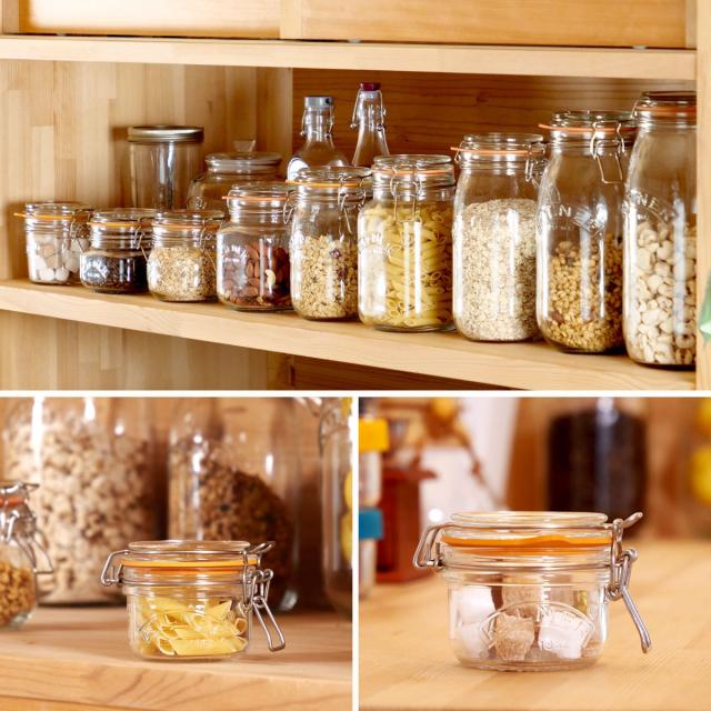 KILNERの保存瓶は、食材や用途に合わせて選べる豊富なサイズ展開です。単体での使用はもちろん、種類別で複数使いすれば、キッチンが整って統一した空間が生まれます。透明で中身が一目で分かるので、複数を並べても使いたい時にすぐに手に取れます。