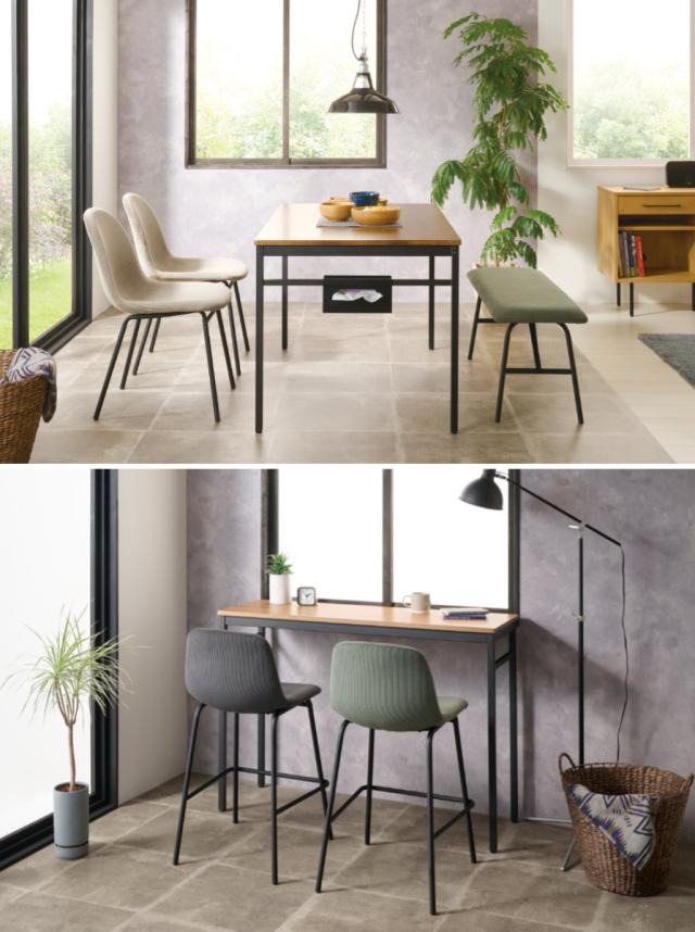 明るめのナチュラルな雰囲気に、引き締まった黒いフレームのインダストリアルデザインが魅力の「ノアル」シリーズ。別売りのテーブルとチェアやベンチを合わせることで、メリハリが聞いたアクセントのある空間に仕上がります。