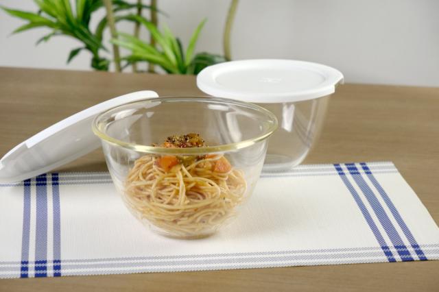 フタをしたまま電子レンジで使える、ガラス製のボウルセットです。作り置きした料理やボウルで混ぜた食材をそのまま加熱できるので、下ごしらえや様々な調理に活躍します。ラップを使わずにすむのでエコで経済的なのも嬉しいポイントです。