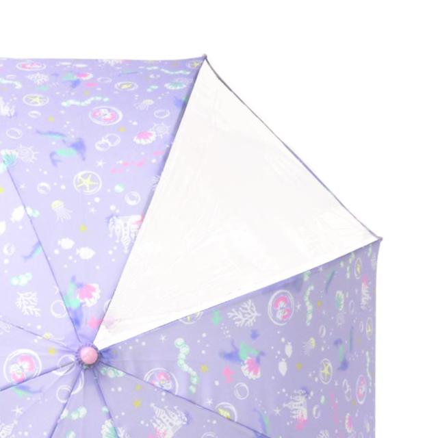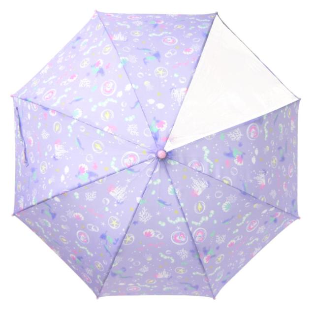 マーメイドやシェルなどが描かれた、手開き式の傘です。親骨45cm、対象身長90-105cmの園児向けサイズです。