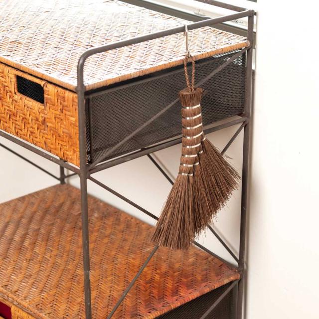 熟練された職人の手で丁寧に作られた棕櫚ほうきです。鶏のトサカのようなフォルムが特徴的で、窓の桟や小さな隙間に溜まった細かなゴミを集めるのに便利です。扱いやすい小ぼうきなので、テーブルや棚の掃除にも役立ちます。どこに掛けて置いておいてもインテリアの邪魔をせず、空間をおしゃれに演出します。