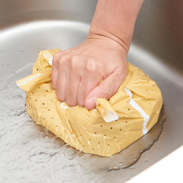 袋の下部に穴があり、水切りができるようになっています。ゴミが溜まったら、持ち手部分をしっかり結び、押し込むように絞ることで水分を外に出してそのまま捨てることができます。お手入れ要らずでキッチンを清潔に保てます。